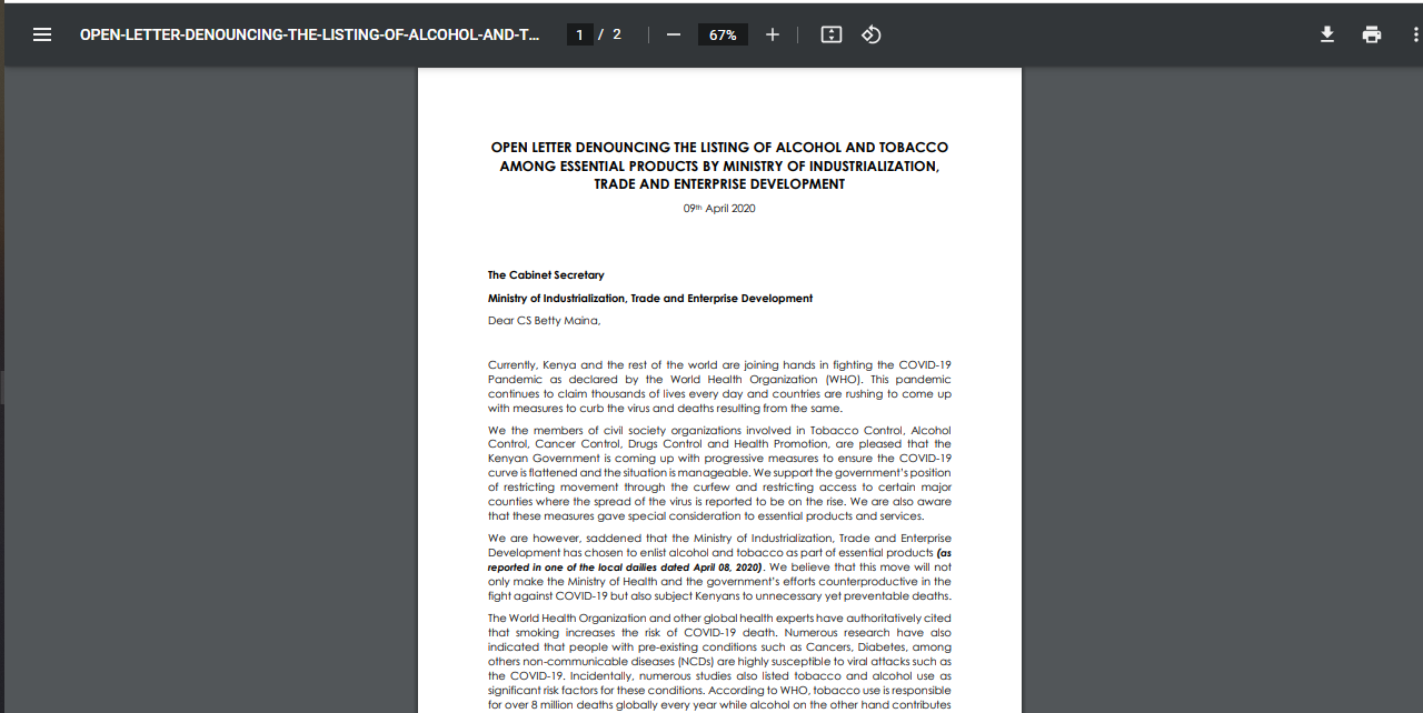 You are here: Home>Resources>Downloads>OPEN LETTER DENOUNCING THE LISTING OF ALCOHOL MINISTRY OF INDUSTRIALIZATION, TRADE AND ENTERPRISE DEVELOPMENT (MOITED)AND TOBACCO AMONG OF ESSENTIAL PRODUCTS BY